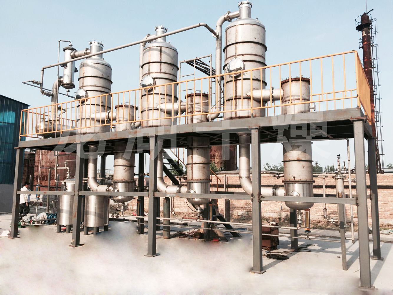 張家港某公司金屬清洗廢水使用現(xiàn)場,蒸發(fā)量每小時200kg,雙效蒸發(fā)器,配備電加熱蒸汽發(fā)生器